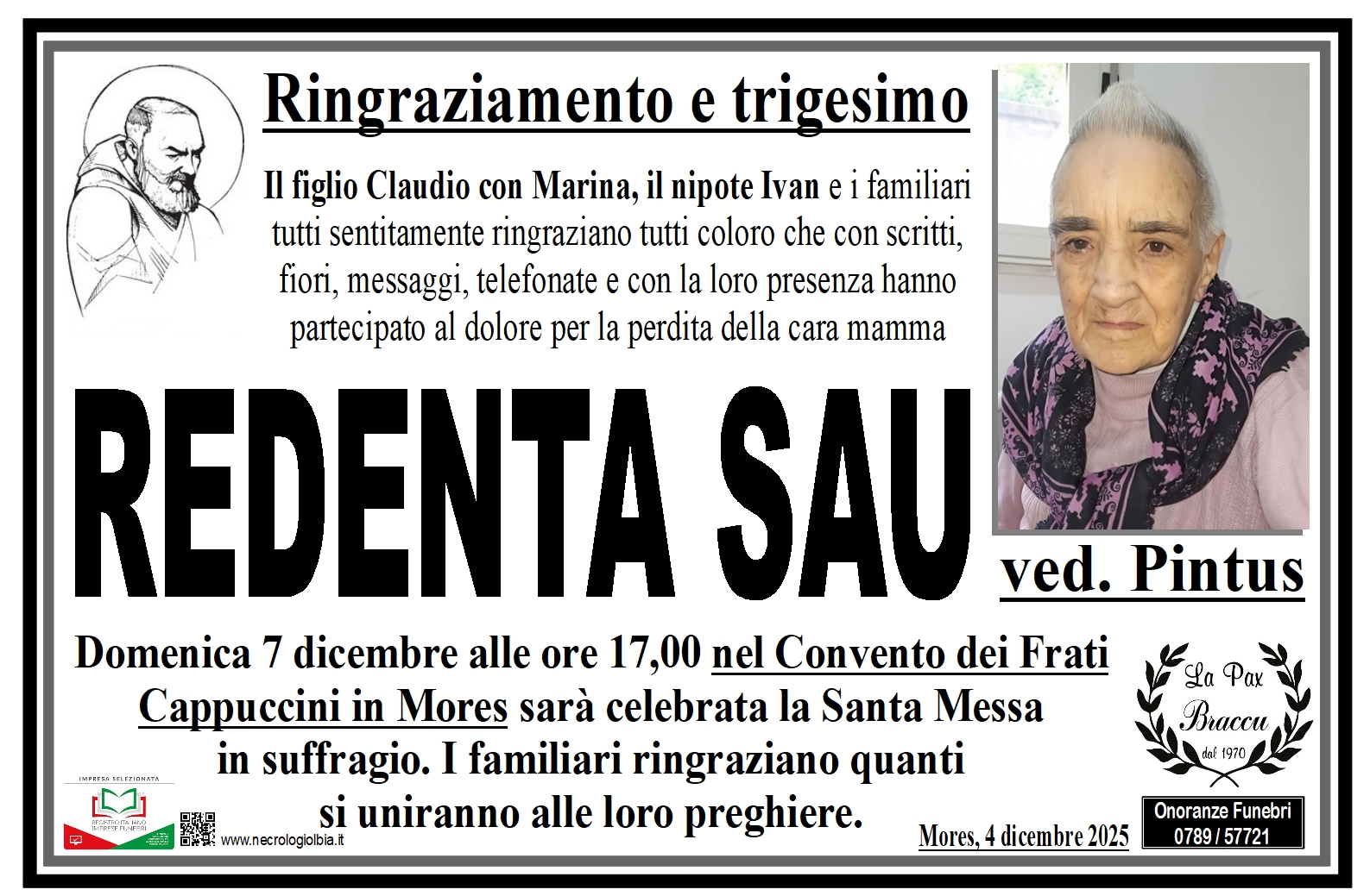 I funerali avranno luogo sabato 8 novembre alle ore 15,30 nella Chiesa di Santa Caterina in Mores con partenza dalla Casa Funeraria La Pax Braccu Olbia Via Bazzoni Sircana, 13/D.