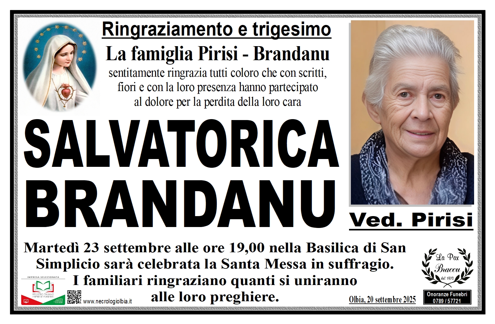 I funerali avranno luogo lunedì 25 agosto alle ore 10,00 nella Basilica di San Simplicio in Olbia con partenza dalla Casa funeraria La Pax Braccu via Bazzoni Sircana, 13D.